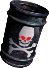 Se trata de un barril negro de gran tamaño, aparentemente mecánico.1 Un emblema de calavera y tibias cruzadas con ojos rojos brillantes está impreso en Dumb Drum.