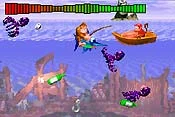 Al empezar el juego, apareces en una pantalla inundada de agua. En la parte superior, aparecerá Donkey con una caña de pesca y una barca con Diddy. También aparece un anzuelo que puedes dirigir pulsando el mando en cualquier dirección y varios peces y pulpos atravesando la pantalla.