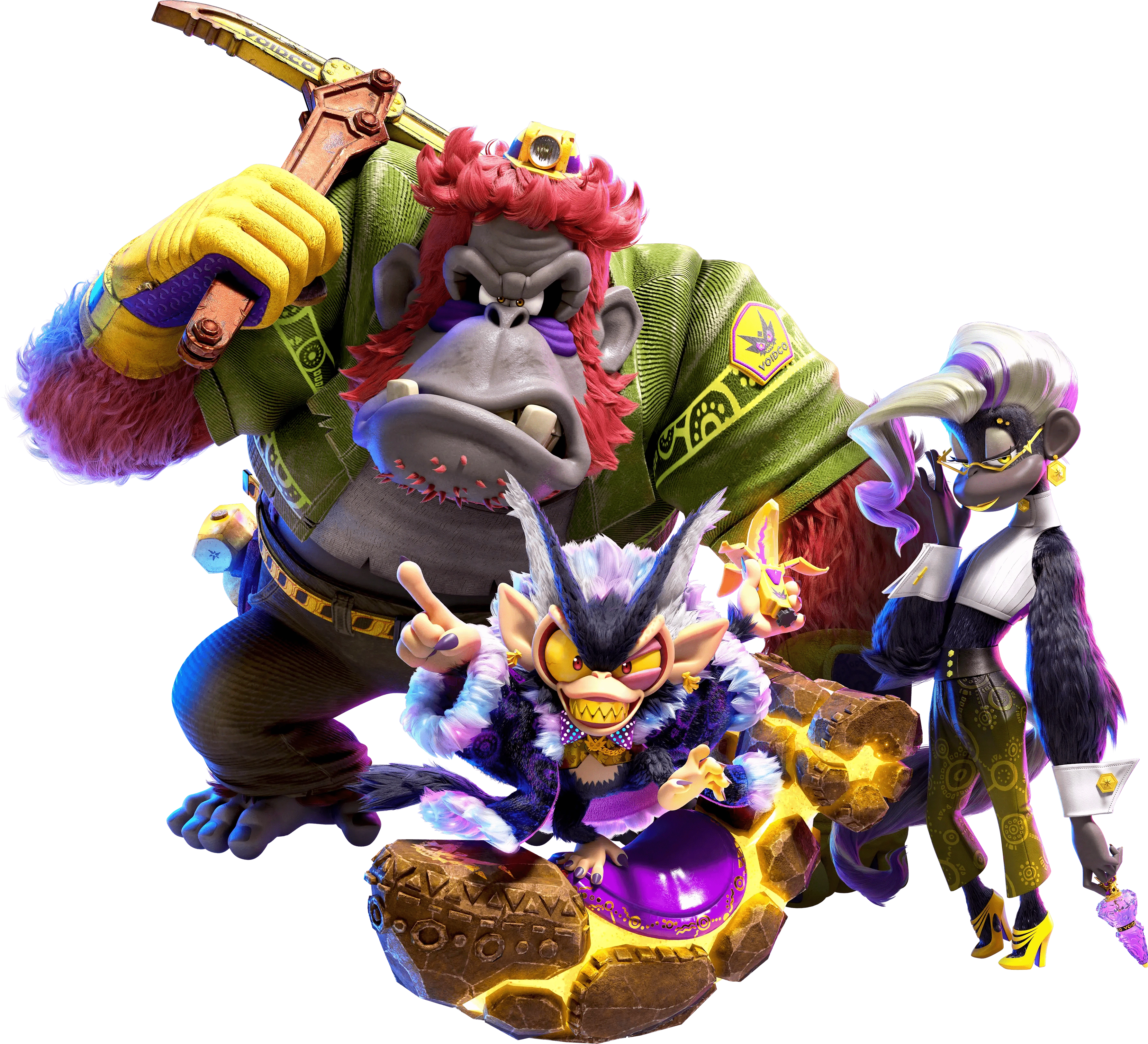 Tres miembros conocidos incluyen a Grumpy Kong, un gran orangután con atuendo de minero, Poppy Kong, un mono femenino que es responsable de recopilar información, y su líder Void Kong.