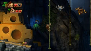 Crumble Cavern is the first secret level in the Autumn Heights world from the game Donkey Kong Country: Tropical Freeze. This secret level become accessible after clearing the level Sawmill Thrill by using an alternative exit. It is preceded by Wing Ding and followed by Rodent Ruckus.