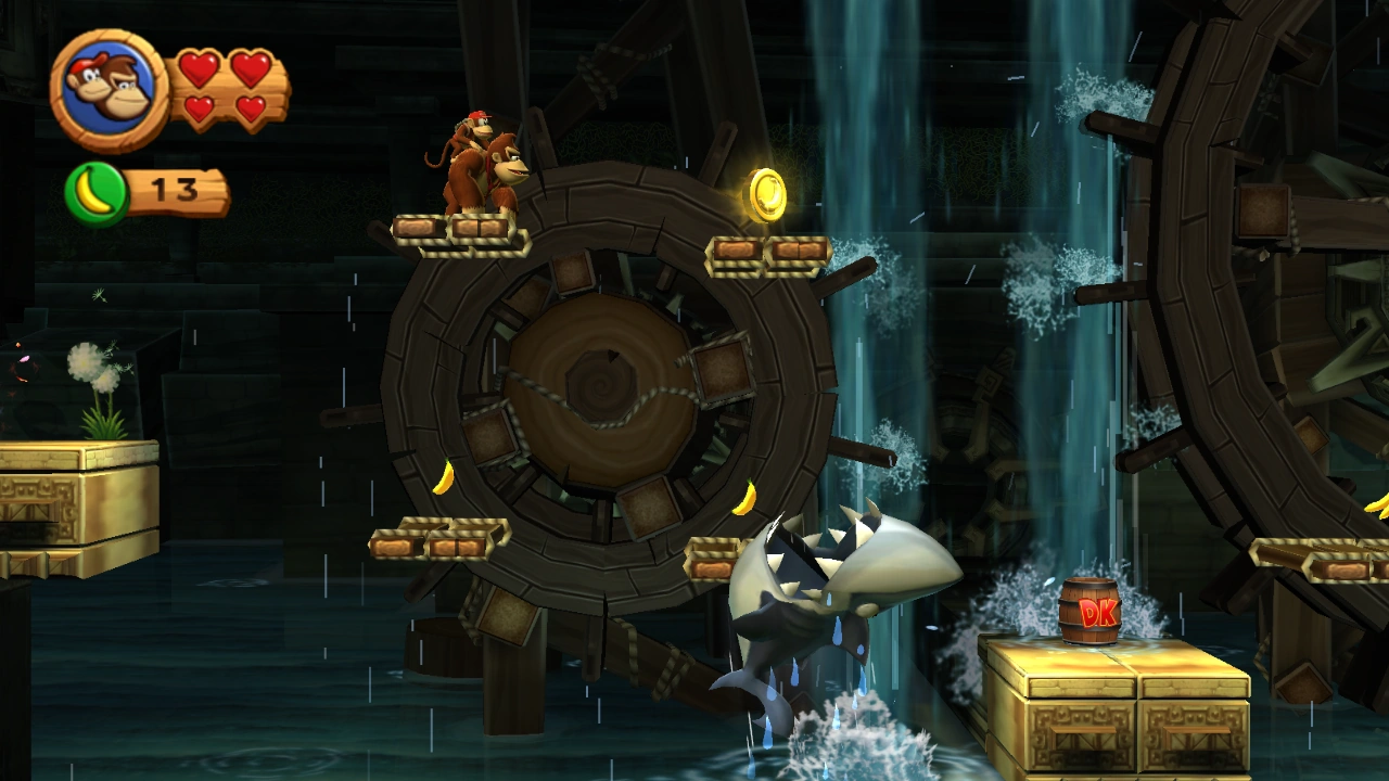 - 1: When the Kongs find the first DK Barrel, they must pick it up and ride on the following water wheel. As they approach the top of the wheel, they can find a hanging bag, which they can break by throwing the barrel at it. The Puzzle Piece is inside the bag.