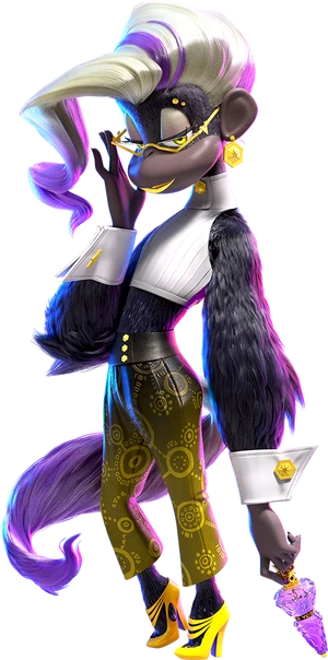 Poppy Kong could either be a colobus monkey or a white-cheeked spider monkey (given her black and white fur and fluffy tail and tall and slender appearance.) Her white hair has purple highlights, and she sport a "golden" look with her glasses, lips, and jewelry. Her outfit consists of a white sleeveless midriff with matching wrist cuffs, pants that go from black to yellow, and high heels with her toe thumbs popping out. Her weapon of choice is what appears to be a perfume bottle.