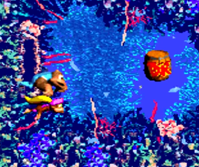 Ripcurl Reef takes place in the coral reef, and the main gimmick is the strong currents that push the Kongs in the direction they move in. The primary enemy in the level are the palette swapped Lurchins, who have green bodies, golden shells and purple spikes. The other enemies are green Kocos and Bazzas. Because Enguarde the Swordfish is absent in the level, Dixie and Kiddy have no way of defeating the enemies, and are only able to swim around them. Some parts of the level also have branched paths.