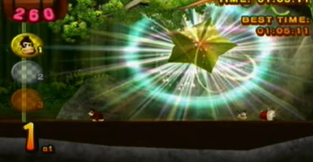 Ninjape Rally is the first stage of the Star Fruit Kingdom. Donkey Kong raced against four Ninjapes. He does not need to win the race to advance to the second stage. Flurl the Squirrel helped Donkey in this stage.