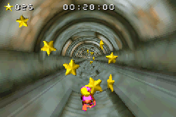 Thus, Swanky reworked his business into Swanky's Dash, a virtual-reality game involving Dixie Kong running through a pipeline filled with small stars and spike balls. There, she must collect as many stars as possible. The price for playing the game is two Bear Coins, and only Dixie can do this game since Kiddy is too young, making him unable to compete in the mini-game.