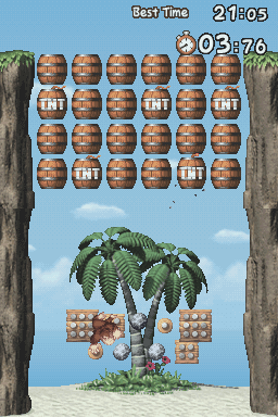 The minigame has two modes: Normal and Challenge. Donkey Kong must climb some pegs, grab some rocks nearby and throw them at all objects (barrels, boulders and dirt blocks) at the screen in order to earn points within a time limit. If he gets all of them in the quickest way possible, he will get a high score. TNT Barrels are present in this minigame as well, and will destroy any objects next to them.