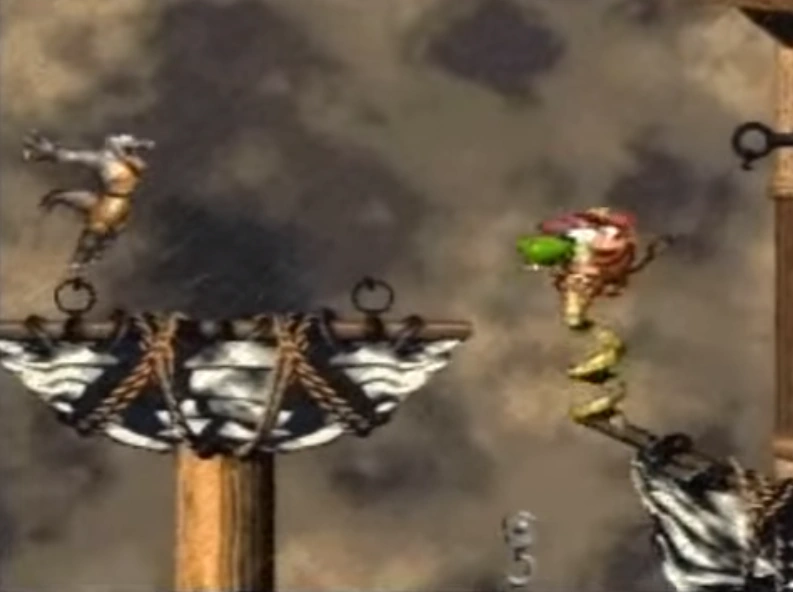 It is another vertical level, where Diddy Kong and Dixie Kong must reach the top. Unlike Mainbrace Mayhem, Topsail Trouble takes place during a rainstorm. Rattly makes his first appearance in the level, and his animal crate is at the very start. The Kongs can optionally ride Rattly for the first half, up until the No Animal Sign, and make use of his high jumping ability to travel higher more easily. If they do not ride Rattly, the Kongs must jump from hooks to move between platforms and masts. During the second half, the Kongs must climb up horizontal and vertical ropes while avoiding enemies, especially Zingers.