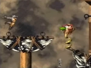 It is another vertical level, where Diddy Kong and Dixie Kong must reach the top. Unlike Mainbrace Mayhem, Topsail Trouble takes place during a rainstorm. Rattly makes his first appearance in the level, and his animal crate is at the very start. The Kongs can optionally ride Rattly for the first half, up until the No Animal Sign, and make use of his high jumping ability to travel higher more easily. If they do not ride Rattly, the Kongs must jump from hooks to move between platforms and masts. During the second half, the Kongs must climb up horizontal and vertical ropes while avoiding enemies, especially Zingers.