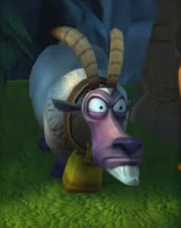 The appearance of this unseen enemy can be described as having a bell on its neck, having a purple head and neck, as well as a darker shade of purple for its nose. It has an angry expression, and has two wrinkled eyelids. It has black pupils, and a white iris. It has dark hooves, and has a white coat of fur. It has two curled back horns that have five lines on them. It has a beard at the bottom of its chin which is grey, as if it were a mountain goat (which fits the setting).
